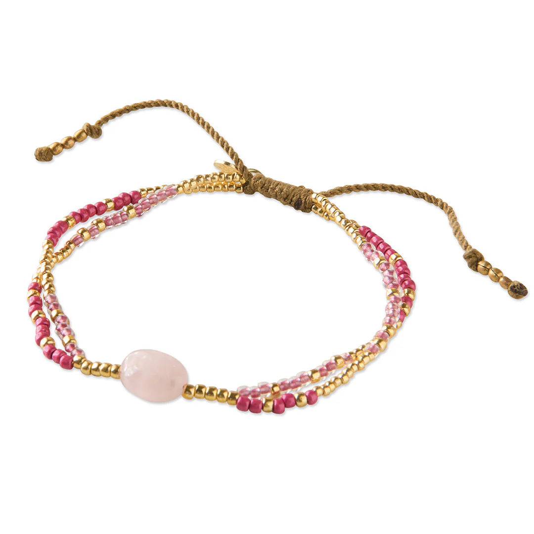 Ce bracelet est fait de perles de verre et d'une pierre de quartz rose sur deux liens en coton, avec un noeud ajustable coulissant. Chaque pierre précieuse est unique. C'est pourquoi la couleur de votre bijou peut être légèrement différente de celle de la photo.