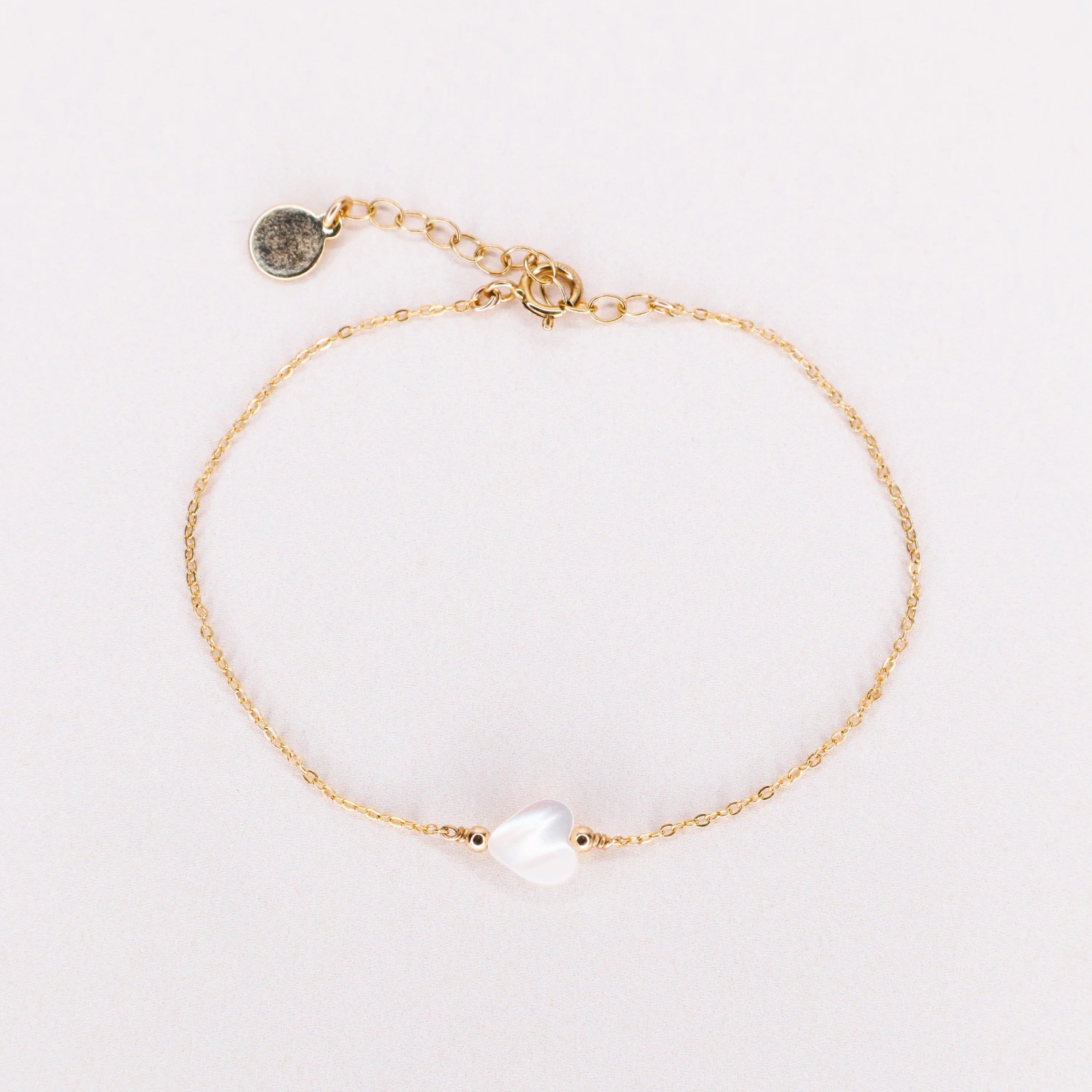 Bracelet en or laminé 14 carats, incrusté d'une pierre de nacre en forme de cœur.