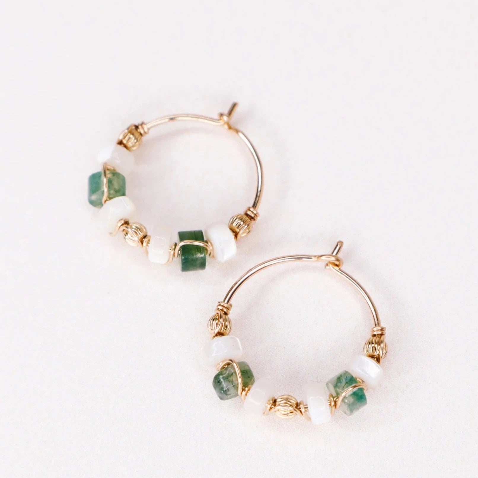 Boucle en goldfilled (alliage de laiton et d'or 14ct), ornées de pierres naturelles d'agate botswana et de perles de culture blanches.