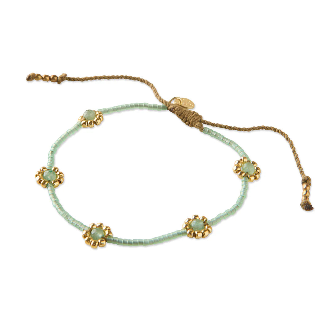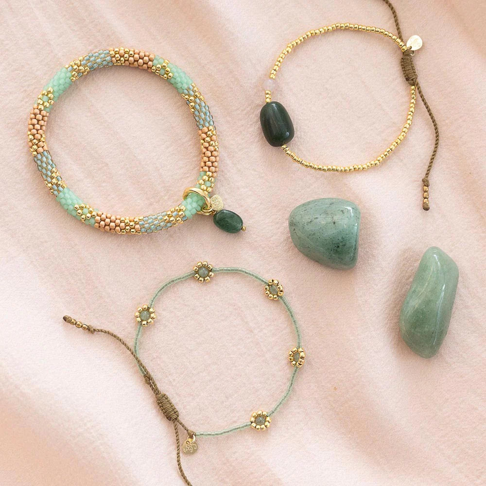 Ce bracelet est fabriqué à la main avec des pierres d'aventurine, des perles de verre vertes et dorées enfilées sur un fil de coton.