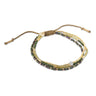 Ce bracelet est fait de perles de verre dorées et vertes et d'une pierre de labradorite, sur trois liens en coton, avec un noeud ajustable coulissant. Chaque pierre précieuse est unique. C'est pourquoi la couleur de votre bijou peut être légèrement différente de celle de la photo.