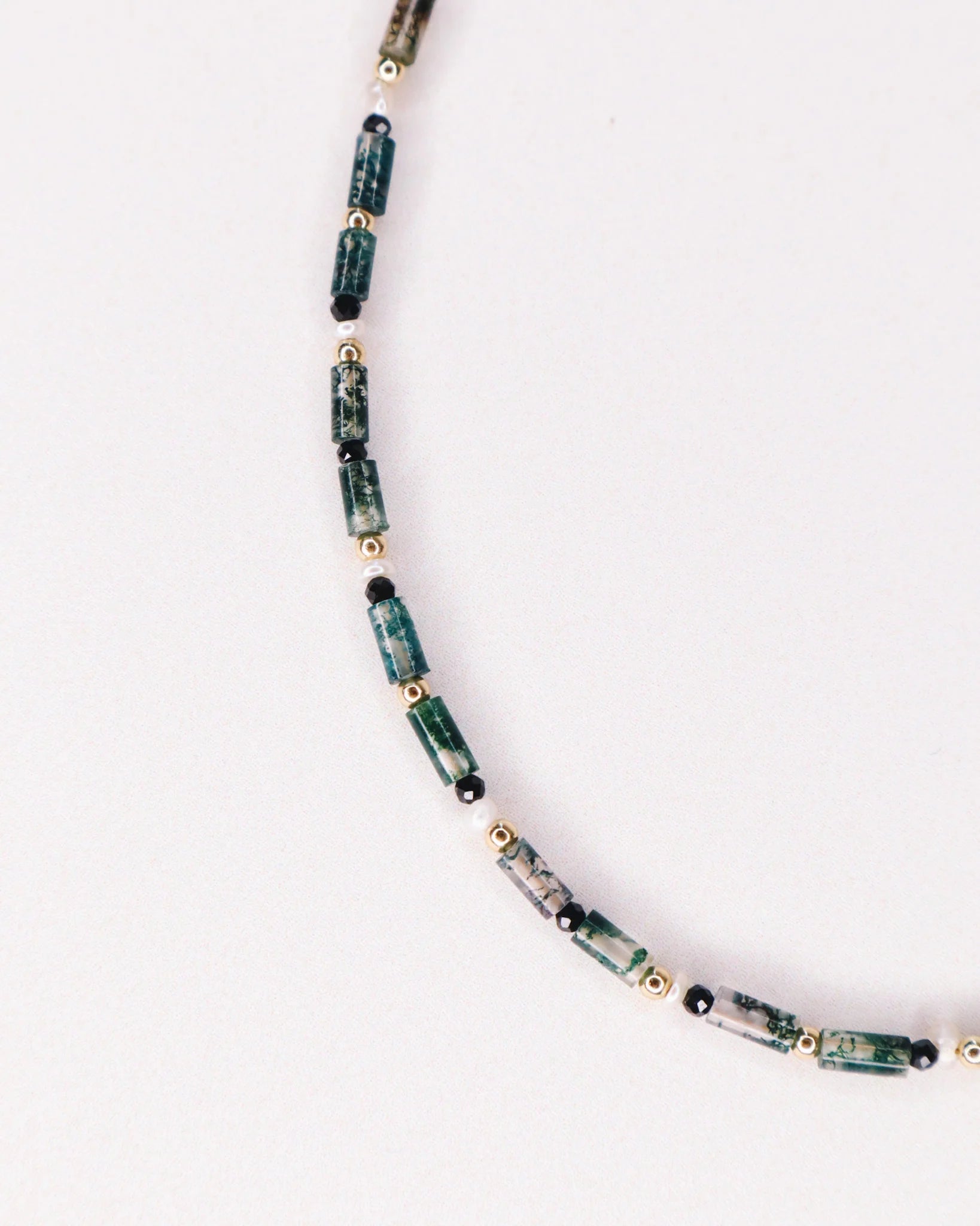 Collier unisexe en or laminé. Enfilage de pierres d'agate mousse verte, de perles de culture et de spinelles noires.