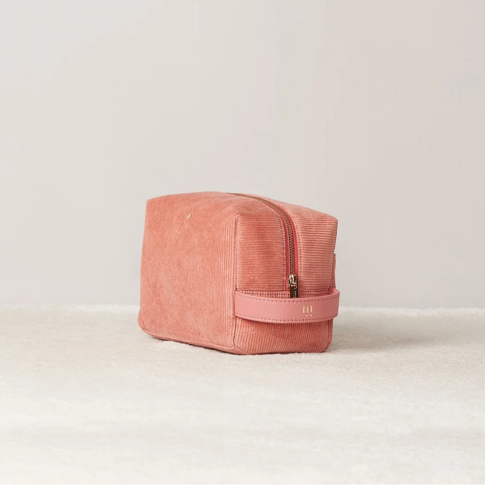 Trousse en velours côtelé rose et son piping en cuir. Doublure 100% coton.