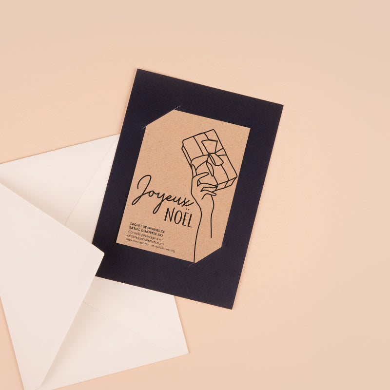 Sachet kraft fabriqué à partir de poudre de coques de cacao, recyclé et recyclable, fabriqué à Nantes (France) contenant des graines à semer.